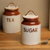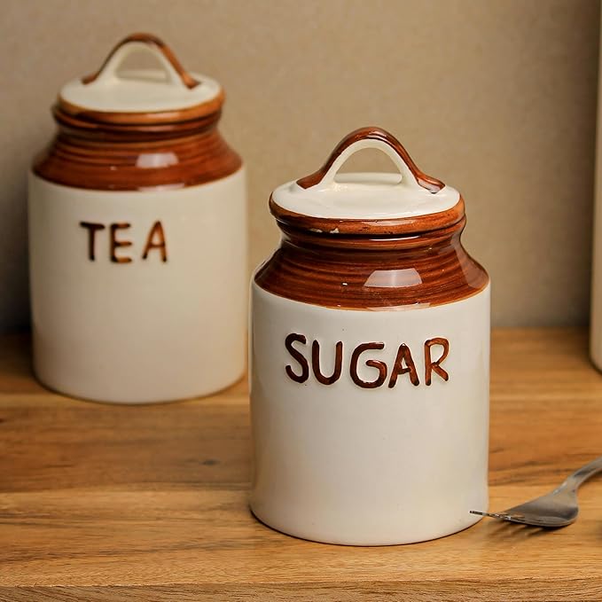 Add a rustic charm to your kitchen with The Earth Store Ceramic Tea and Sugar Jar Set, featuring 500 ML capacity jars. This set includes two beautifully designed jars, one labeled “TEA” and the other “SUGAR,” making it easy to organize and access your kitchen essentials. The durable ceramic construction ensures that your tea and sugar stay fresh and easily accessible while enhancing the aesthetic of your countertop or pantry. The handcrafted design with a classic brown lid provides an elegant, yet practical storage solution. Both jars are designed with easy-tg.o-use handles, offering convenience while using or storing. Perfect for everyday use, these jars add a touch of sophistication to your home decor and are ideal for giftin